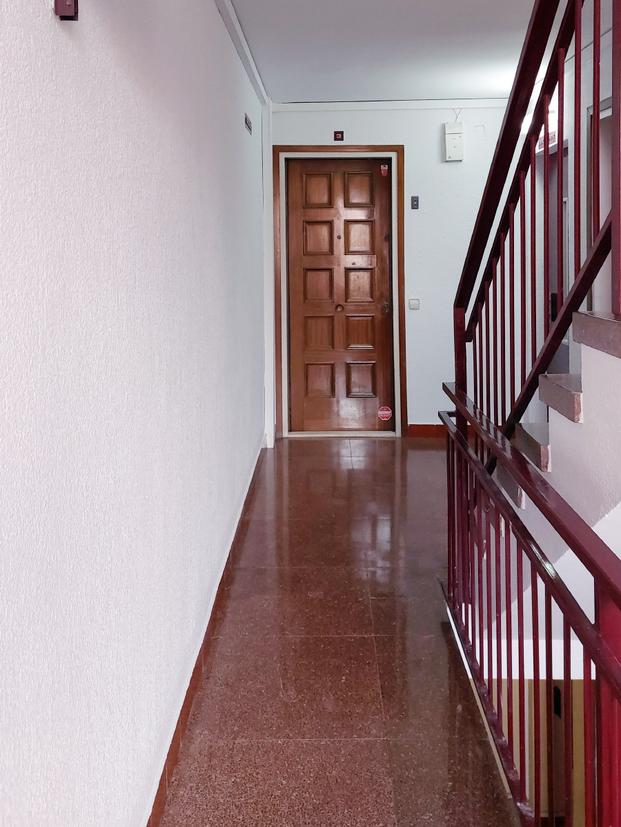 Pintura interior del portal de acceso a la escalera: techo y paredes en blanco.